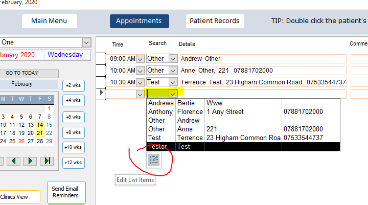 In the search field click the drop down arrow to open the list of patients. Click the Edit List Items ison at the bottom of the list: