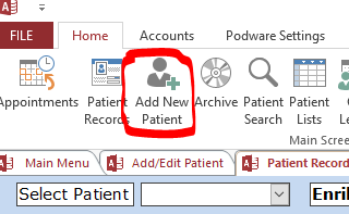 Go to Home tab > Add New Patient:
